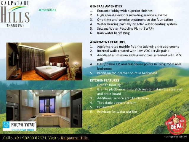 Kalpataru hills offer one of the best combinations of being closer to the city combined with the peaceful environment. The project offers excellent hill view. Right in front of the project is an entertainment park. The only problem is the current approach to the property. With a huge amount of supply coming in Thane in future, appreciation in the area can be a problem.
